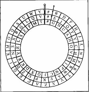 Note that decrypting a message requires following the same steps, only in reverse: Find the character on the outer rotor, note the character aligned with it on the middle rotor, find that character on the outer rotor, then output the character aligned with it on the inner rotor. Don’t forget to rotate the rotors after each letter is decrypted.