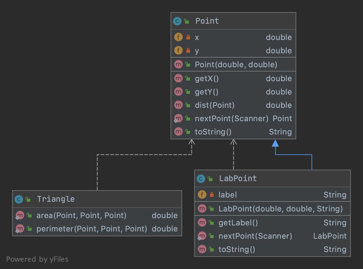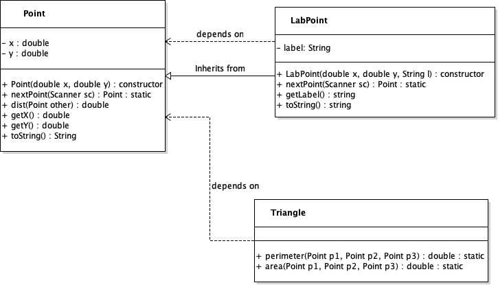 A great tool when you begin to plan out the relationships between classes is to visualize how class depend and extend each other. The UML (or Unified Model Language) is a standard way to describe classes, their members, and relationships. As a starter, consider the UML diagram for the Point