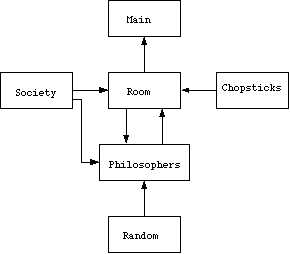 As a final example, consider Figure 15.5. Here each philosopher is given its own window, in which its activity is displayed. Such a screen display would give an animated depiction of the philosophers as shown in Figure 15.3. Because all input/output activity in the philosophical society is carried out by the maître d', this window-oriented display can be achieved by modifying only the body of Room so that the maître d' task uses operations from the windows package of Programs 2.19 and 2.20. We leave this interesting modification as an exercise.